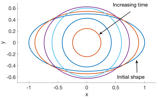 The parameters used were , , and . The exact solution is unknown. The numerical solution at selected times is shown in Figure 5. Since the force density is proportional to the local curvature, the points along the major axis, where the curvature is largest, move in faster than other parts of the membrane. The two points along the minor axis move outward, changing the membrane’s shape into a more circular one. If the permeability is zero, no fluid can escape through the membrane and the membrane approaches a circle with area equal to the area bounded by the initial condition. When the permeability is nonzero, , fluid crosses the membrane as a function of the pressure drop across the boundary. This leads to an ever shrinking shape until it approaches a single point in finite time.