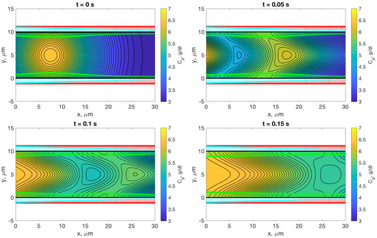 The additional term on the right hand side of the equation is known, as such Equation (20) can be inverted to obtain and the boundary velocities in the permeable region are set to . The boundary velocities are known and the Stokeslet kernel is subsequently inverted for the forces which are used to find the channel fluid velocity. This velocity is then used to advect the plasma protein concentration. In Figure 9, we perform a temporal simulation in which an initial Gaussian concentration profile of protein (yellow circles in top left panel) is advected by the fluid while the fluid is filtered at the wall. As additional concentration is introduced at the inlet (yellow at the left wall in the bottom panels), the concentration develops local maxima at different locations in the channel. This simulation demonstrates the versatility of our method for predicting distribution of proteins throughout the vessel, as the protein concentration can vary with both time and location within the vessel. This is a significant improvement on previous models, which only consider axial changes in plasma protein concentration [38,39,40,41,42].