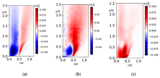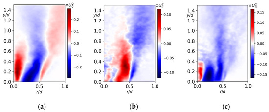 The distributions of the Reynolds shear stresses and the radial Reynolds flux for the low-swirl jet are shown in Figure 9. The presence of the inner shear layer around the central wake resulted in a region of negative values around the jet axis. Because the flow was characterized by a swirl, the radial transfer of the angular momentum, corresponding to the positive region of , was in the outer shear layer, where the jet entrained the surrounding air. The radial turbulent mass flux was also maximal in the outer mixing layer.