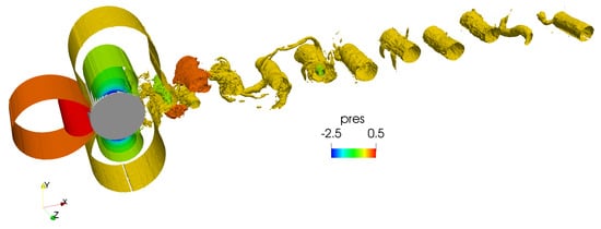 - Lehmkuhl, O.; Rodríguez, I.; Borrell, R.; Oliva, A. Low-frequency unsteadiness in the vortex formation region of a circular cylinder. Phys. Fluids 2013, 25, 085109. [Google Scholar] [CrossRef] [Green Version]