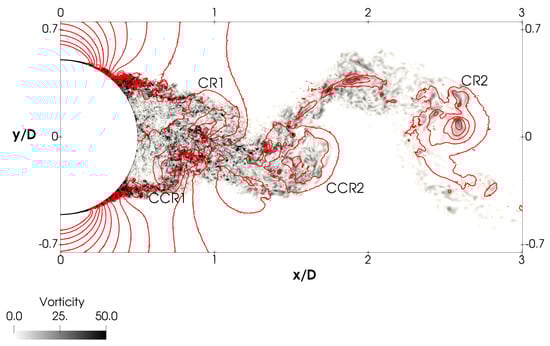 Vorticity peaks at the center of the vortices, as can be seen in Figure 16, but its magnitude decreases as the vortices move downstream from the shear layers to the wake. In the vortex formation region, the non-dimensional spanwise vorticity maximum is around to as the vortices move from to at the outer limit of the recirculation region. This is in contrast with the values reported in the sub-critical regime by Braza et al. [], who observed absolute vorticity to decrease from 3 to 1 as the vortex moves toward the closure of the vortex formation zone. In the wake centerline, the absolute magnitude of spanwise vorticity at the vortex cores diminishes and ranges around (see Figure 16).