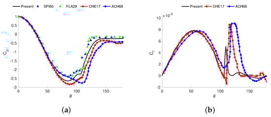 (a) Pressure coefficient and (b) skin-friction distribution along the cylinder surface. Comparison with the literature. SPI65 (Spitzer []), FLA29 (Flachbart experiments taken from []), CHE17 (Cheng et al. []), ACH68 (Achenbach []).