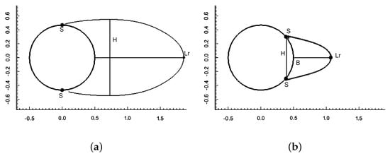 The classical representation of the mean recirculation zone behind a cylinder at the sub-critical Reynolds numbers [,] is depicted in Figure 5a. In this representation, this zone is enclosed within the separating flow streamlines. Flow separation (marked as S) occurs near the cylinder apex, whereas the recirculation region is closed somewhere downstream in the wake (marked as ). The length of the recirculation zone is then defined as the distance from the cylinder rear to the point in the wake centerline, where the recirculation region is closed (). The half-height of the recirculation bubble (H) is measured from the wake centerline to the thickest point of the recirculation zone. A similar representation can be made for the super-critical wake (see Figure 5b). In this case, the detachment of the flow (marked as S) is delayed and occurs in the cylinder rear around (measured from the stagnation point). Owing to the delayed separation, the shear-layers are bent toward the wake centerline. This also is reflected in the separating streamlines, which are closer each other, yielding a smaller recirculation zone. Notice that the half-height of the recirculation zone is measured, in this case, at the separation points (thickest point of the recirculation region) rather than downstream of the cylinder as in the subcritical regime.
