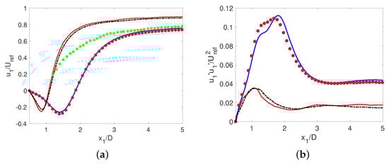 (a) Stream-wise velocity and (b) its fluctuations in the wake centerline. Comparison with sub-critical and super-critical results. The red solid line present the results; (black dash-dot line) []; (blue line) []; (purple circles) []; (green squares) [].
