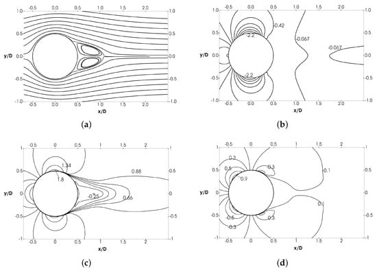 Near wake mean field. (a) Streamlines; non-dimensional iso-contours of (b) pressure coefficient (); (c) stream-wise velocity (); (d) cross-stream velocity ().