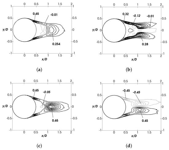The Reynolds stresses at constant phase are evaluated and shown for phase in Figure 17. Random normal Reynolds stresses are concentrated in the regions of high vorticity, i.e., at the vortex cores. Overall, random maximum values of the Reynolds stresses are observed in the vortex formation zone. For the streamwise normal stresses, , these extrema are located at the core of the forming vortex, whereas for they are located nearby the closure of the vortex formation zone. In the wake, normal Reynolds stresses maxima are located at the vortex cores, whereas the shear stresses maximum is in the region between vortices. It is observed that the peak value for is around 0.08. As vortices move downstream into the wake, the peak registered at the vortex center decreases; it is about at . The value reported by CC for the sub-critical wake is about , which is almost 4 times larger. Differences can be attributed to both the location of the separation point from the cylinder and the state of the boundary layer at separation. In fact, the values here reported are in fair agreement with those obtained by Rai [] for a flat plate with turbulent separation. For (see Figure 17b), the peak value in the vortex formation zone is about 0.165, and at the normal streamwise Reynolds stress, the magnitude of the peak at the vortex cores decreases steadily; at , it is about .