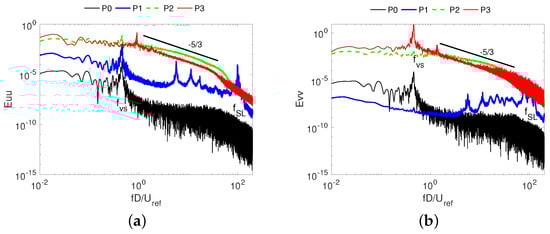 In Figure 12, the energy spectra of the stream-wise and cross-stream velocity fluctuations are plotted. As can be seen in the figure, different flow regimes are observed, from the laminar flow in the cylinder boundary layer (probe ), to the transitional flow (probe ) and the fully turbulent flow in the wake of the cylinder (probe ), where the energy spectrum exhibits the typical slope in the inertial subrange. The spectra exhibit a pronounced peak at , which can be identified with the large-scale vortex shedding frequency. As commented in Section 3.1, this value is in good agreement with those reported in the literature. The peak is detected by all the numerical probes, although its energy content might be different depending on the location of the probe. Notice also that for the probe located in the wake centerline, i.e., , due to the symmetry of the flow, the peak for the streamwise velocity fluctuations is located at twice the vortex shedding frequency.