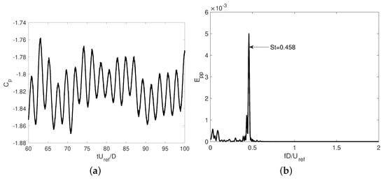 For the ensemble average, 10 vortex shedding cycles are used to generate each coherent component. Measurements of the phase-averaged quantities need a reference signal from which the phase of the flow is determined. In this case, the reference signal is obtained from a probe located in the front of the cylinder at from the stagnation point (see Figure 14). In this region, the flow is more dominated by the periodic wave rather than by turbulent effects. The signal of the pressure coefficient exhibits clearly a strong periodic component, and it is not affected by the turbulence developed downstream. As can be seen from Figure 14b, the energy spectrum of the pressure coefficient fluctuations exhibits a dominant peak at the vortex shedding frequency . Thus, the signal of the pressure coefficient is here used as a periodic oscillator. Following the period of the oscillator, the flow field is then classified according to its phase angle by dividing each period into windows of . However, due to the large storage capacity required for the 128 phase angles, only 8 of them were recorded (i.e., every phase angle).