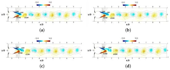 In Figure 15, the streamlines at constant phase during half of the vortex shedding period are plotted. Additionally, in Figure 16, the phase-averaged vorticity and the pressure contours at constant phase are also given. Phase (see Figure 15a and Figure 16a) starts when the clockwise rotating vortex (CR1) is shed into the wake, and the lift coefficient has reached its maxima (). A new vortex starts to be formed on the top shear layer (CR2), whereas the counter-clockwise rotating vortex (CCR2) in the bottom shear layer steadily rolls up and grows from phase to . The location of the saddle point moves downstream and toward the wake centerline as CR2 develops. The half vortex shedding period ends when CCR2 is about to be shed into the wake and the lift coefficient reaches its minima ().