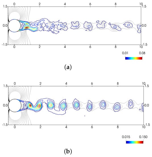 Figure 8 shows the non-dimensional normal and shear stresses together with the turbulent kinetic energy (k) distribution in the near wake. Reynolds stresses are significant along the shear layers and, in particular, reach the highest values before the separation of the boundary layer from the cylinder. In fact, Reynolds stresses become noticeable before the formation of the so-called laminar separation bubble (LSB) that forms in the rear side of the cylinder (see, for instance, Figure 6 in []). In the literature, it has always been stated that, in the super-critical regime, the flow separates laminarly from the cylinder surface and, just after separation, the transition to turbulence occurs, which makes the flow reattach to the cylinder, forming a LSB (see, for instance, [,,]). However, as will be further discussed, instabilities in the boundary layer are early triggered, giving rise to rapid transition to turbulence in the attached boundary layer before separation (see the magnitude of the Reynolds stresses and turbulent kinetic energy plotted in Figure 8). This can be appreciated as a characteristic trait of the super-critical regime, i.e., transition to turbulence and the increased momentum transport due to turbulent fluctuations force the boundary layer to keep attached to the cylinder surface much longer, beyond the cylinder apex (the separation location in the sub-critical regime). As a result, it is expected that Reynolds stresses might reach extrema in this region. In fact, both stream-wise normal and shear stresses have a local maximum around the location where the small recirculation bubble closes, i.e., the angular location that corresponds with these peaks is about , which is quite close to the location where the laminar recirculation bubble closes ( also in agreement with the value reported in Rodríguez et al. []). The peak intensities are 0.1 at and 0.061 at for and , respectively.