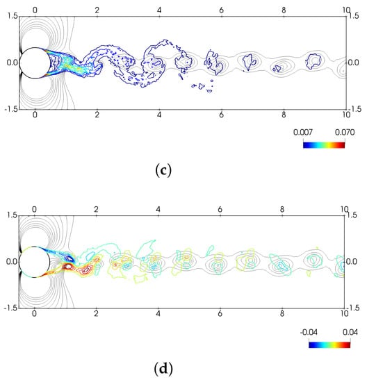 Distributions of the phase-averaged characteristics of the normal and shear Reynolds stresses for the sub-critical wake were provided by CC, Braza et al. [] and Perrin et al. [] at Reynolds number . In particular, CC investigated the contributions for the different components and pointed out the mechanisms of turbulent production and the role of the saddle points in the entrainment and turbulent production.
