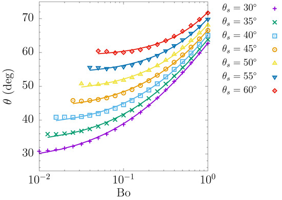 The dynamic contact angle, traced as a function of both the surface wettability and the Bond number in case of a stable advancing 1D film, is presented in Figure 3. It is worth pointing out that the critical Bond number, which defines the transition between film instability occurrence and stable film (leftmost markers in Figure 3), depends on the imposed surface wettability, with a higher contact angle leading to higher critical Bond number (thus, the film is likely to be subject to instability phenomena at lower surface wettability). As widely reported in literature [12,27,28], the cube of the dynamic contact angle depends on the film velocity according to Tanner–Hoffman–Voinov law,