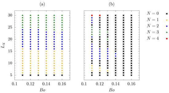 A single array of lower wettability contamination spots, characterized by an increased value of the imposed static contact angle, was investigated, as pointed out in Section 3.1. A somewhat similar setup was investigated by Zhao and Marshall [12], who imposed a sequence of vertical strips, with different contact angle inducing fingering instability. Here, the eventual film instability is induced by localized spots. Furthermore, higher contact angles are here investigated, as allowed by the full modelization of the free surface curvature. The influence of both the dimensionless distance between successive contamination spots and the film Bond number, Equation (10), on the resulting liquid layer distribution were analysed, in terms of number of observed rivulets. Parametric computations were run, in the range and . The static contact angle was set to over the whole computational domain, except inside the contamination spot, where the contact angle was set to an increased value of , while the plate slope was set to . According to literature [12,13,18,20], the precursor film thickness was set to , while the disjoining exponents were set to , . Spatial discretization steps of were imposed in order to ensure grid independency, while was chosen as the plate length along the downhill direction, in order to let the liquid film develop and, thus, avoid boundary effects.