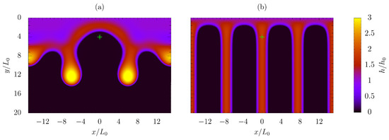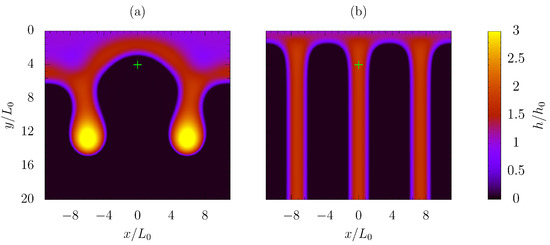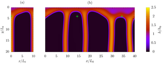 In order to test the consistency of the applied boundary conditions (i.e., half of the periodic length investigated, contamination spot located at and symmetry conditions applied to and ), a larger domain of width (thus, including 2 contamination spots, located at ) with periodic conditions, applied through and , was also simulated. In fact, the latter test case allows the film to evolve in a larger domain (4 times the characteristic perturbation length from linear theory), mitigating the artificial constraints deriving from forcing the film to follow the geometrical symmetry. A configuration characterized by low Bond number, , giving a film subject to instability phenomena even when weak perturbations are introduced, was considered. As demonstrated by Figure 10, which shows the liquid layer distribution resulting from the two different computations at the same instant , the same number of rivulets per unit length is predicted, meaning that the results proposed in the bifurcation diagram, Figure 4b, are statistically consistent, although the solution is less regular and may also have some oscillations in time.