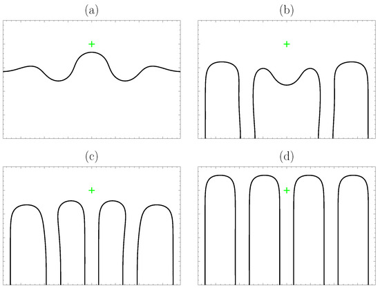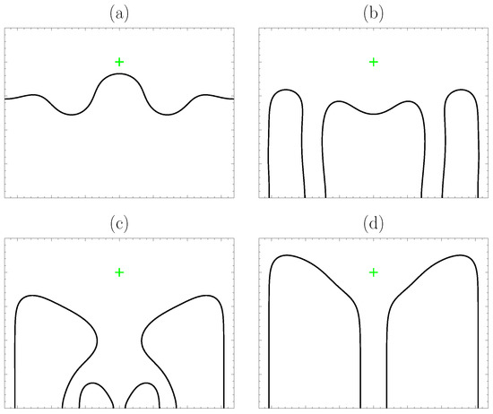 For a better understanding of the contact line dynamics, different screenshots of the moving contact line are taken from two different computations at and slightly different . In Figure 8, which refers to the same test case as Figure 7, , the contact line position is traced at successive instants: 3 rivulets have already formed at , Figure 8a; after the rivulets develop and become narrow, there is enough space for one more rivulet front to form below to the contamination spot and drain, Figure 8b,c; as long as the generated dry patches are stable, all the rivulets just settle down and remain as stationary rivulets, Figure 8d.