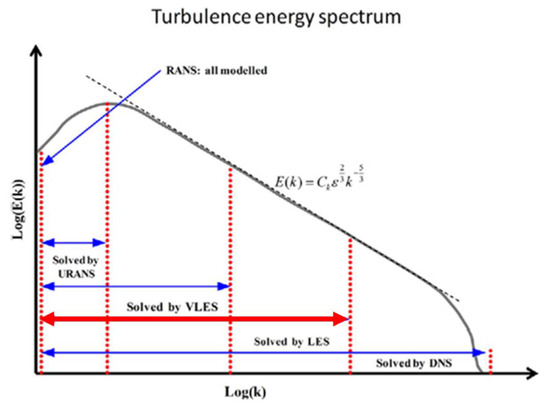 Schematic representation of turbulence energy spectrum and different modeling approaches from URANS to DNS and the associated required levels of modeling resolution [9].