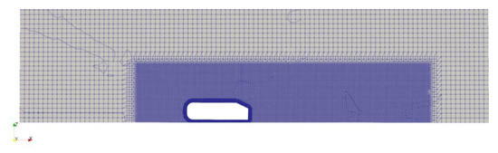 In order to generate the mesh refinement of the domain, the blockMesh file was modified at each step. For example, firstly, the mesh size of the fluid domain was 0.14 m in all directions; afterward, it was reduced to 0.12 m. As a result, the mesh cell number was doubled each time approximately. This was performed until the mesh convergence was completed; in other words, the simulation results are independent of the mesh size. Table 1 demonstrates the mesh convergence study with drag coefficient comparison. As can be seen from Table 2, the relative difference between the 1st and 2nd mesh is 8.54%; therefore, further meshing was required. Eventually, the difference between 4th and 3rd was calculated to be 1.65%, which shows that 4th mesh is the optimal one, and further mesh refinement is not required. This mesh was used to perform the URANS and VLES simulations, which were found to generate sufficient resolution for the wake structures. It should be noted that, generally speaking, one can only use time-averaged parameters to check mesh convergence and validate the results with measurements as the experimental measurements are all time-averaged, which means that RANS simulation is sufficient in the convergence study. Theoretically, it is also impossible to compare two 4D transient flows apart from their corresponding time-averaged parameters. Further mesh refinement will improve the resolution of the turbulent eddies, and the time-averaged quantities of flow variables remain the same.