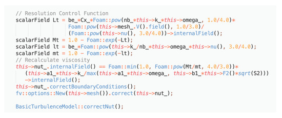 The resolution control factor Fr was included in the newkOmegaSSTBase.C, as shown in Figure 9 below. Equation (17) (Resolution Control Function) was used to rescale the turbulence viscosity of the k-ω SST turbulence model, as well as the known coefficients, which were declared in the newkOmegaSSTBase.H file. As a result, the new VLES model was implemented in a modified source file of the k-ω SST turbulence model.