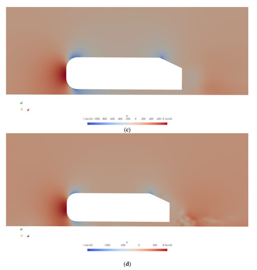 Pressure Contours for (a) RANS; (b) URANS; (c) VLES steady; (d) VLES simulations.