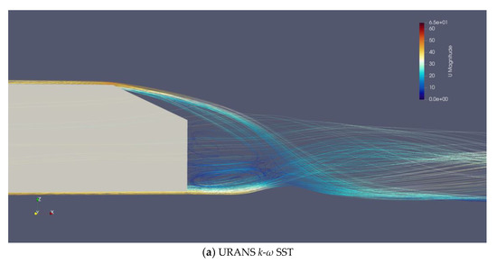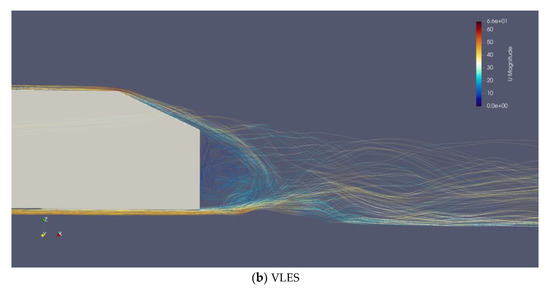 Figure 14 illustrates the flow field streamlines at the back of the Ahmed Body by URANS and VLES, which illustrates the recirculation zones at the rear end after slant angle surface, as well as the counter-rotating vortices over the two sides of the slant. The rear recirculation zone happens due to the separation of flow at the rear, which develops the low fluid energy zone at the back of the Ahmed Body. Moreover, the VLES simulation generates far richer flow structures here for the complex 3D turbulent separated flow around the Ahmed Body and is confirmed by the experimental observation, which is shown in Figure 2.