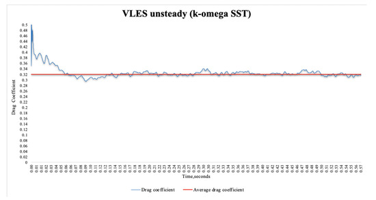 Figure 15 and Figure 16 represent the predicted drag coefficients as functions of time by the k-ω SST URANS and VLES models, respectively. The fluctuations of drag coefficients develop due to the transient nature of the flow field because of shear layer instability, unsteady flow separation and flow recirculation. Therefore, as can be seen from Figure 15, the time-averaged drag coefficient by URANS was approximately 0.329, which differs from experimental data by 10.4%, as shown in Table 3. The VLES simulation was performed, and the predicted drag coefficient as a function of time was plotted in Figure 16. The average drag coefficient was approximately 0.3127, which was 4.93% higher than the experimental data. It is thus further confirmed that the VLES turbulence model is found to be the best among RANS, URANS, VLES, DES and LES models.