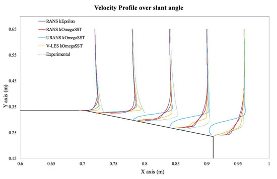 The graph shows the agreement of the simulated velocity profiles with the experimental ones, where the best match is observed to be the results of the VLES model. Moreover, it is noted that the velocity profiles between RANS k-ω SST and k-ε models were very similar. Nevertheless, the profiles predicted by the RANS k-ω SST model were closer to the experimental data than the k-ε model in the separation zone, as expected. The notable point is seen in the first two results, where the experimental profiles did not reach the surface of the Ahmed Body completely. Hence, the simulation results extend beyond the experimental results [27].