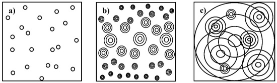 The microscopic theory leading to closure (4) goes back to Ludwig Prandtl, who in 1925 published his mixing-length turbulence model [20]. As a result of the similarity of Equations (2) and (4), he applied the ideas of the kinetic theory of gases to derive a kinetic theory of turbulence. We do not present the development of the model by Prandtl, but will demonstrate an analogy of the two approaches in a very brief manner. Prandtl’s derivation led him to the following result for the eddy viscosity . Here l denotes the mixing length of the turbulent momentum transfer by the eddies. Rewritten this equation yields: . This is the analogous result to of the kinetic theory of gases (the constant 1/3 may be thought to be absorbed by l). The mixing length of the eddies l is analogous to the mean free path length of the molecules λ and as the molecules have their characteristic velocity also the eddies show such a velocity, . From the second last equation, we see that, if the eddy viscosity and the mixing length l are constant, has a single value and is also constant. In research of turbulence, it is a well-known fact that there is a strong monotonic power law dependence between the eddy diameter and the eddy velocity. Therefore, a single eddy velocity corresponds to a single eddy size. As a result, one has a strong analogy between this turbulence model and the kinetic theory of gases, presented in Figure 2a. In this figure, one may replace the molecules by small single-size eddies. In this simplest approach, a single class of eddies of equal size transfers all the turbulent momentum which is surely not a realistic image of real facts. In a slightly generalized turbulence model, the velocity depends on the spanwise coordinate of the flow. As a result of the strong monotonic relation the eddy size is now also —dependent. Figure 2b shows a picture of the eddies of this generalized turbulence model, where they are of multiple sizes and show a stratification. This is a good step toward a more successful turbulence model. However, studying drawings by Leonardo Da Vinci of turbulent flows [13] shows that he already had recognized that the situation in these flows is even more complex. As shown in Figure 2c, he had drawn pictures of interpenetrating eddies of multiple sizes, that act simultaneously at a given point. In the past the first author had taken this picture as a guideline to develop a ‘microscopic theory’ of turbulence leading to the DQTM (see [13,21,22]). The main idea was to realize a modeling of turbulent momentum transfer based on multi-size, self-similar and fractal eddies [23].