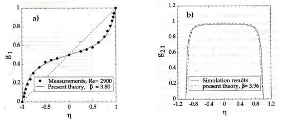 In this section, we study an axisymmetric turbulent jet flow into a quiescent surrounding, where the —direction is identical to the round jet’s axis (the detailed calculations are in Refs. [24,27]). The flow width of the jet from a virtual origin behind the nozzle linearly increases with . Now, the radial spatial coordinate is normalized by the expression . Furthermore, the average downstream velocity is made dimensionless by with its value on the jet axis, , where the mean velocity shows its maximum (see in Figure 4a the right half of the symmetric mean velocity profile with its maximum at η = 0). By combining the two partial differential equations (the continuity equation and the NSE) with the new closure of turbulence (5) which is a difference equation, substituting and the self-similar coordinate and function , the quasi-two-dimensional flow problem becomes one-dimensional which is essential to determine analytical solutions of this turbulent flow problem. By this procedure, the following highly nonlinear ordinary differential equation results: