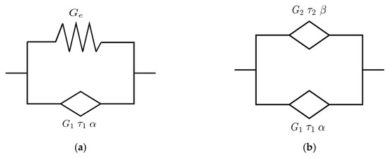 where is fractional exponents (), is the elastic modulus, is the characteristic time, given by the following expression . The complex modulus of the model can be derived applying Equations (14)–(34), obtaining the following:
