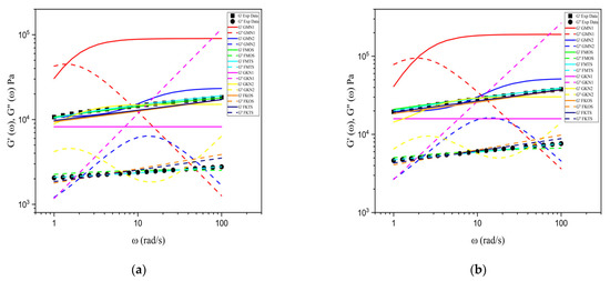 where and are elastic modules corresponding to Maxwell elements connected in parallel in Pa, are the characteristics’ times in seconds, given by the following expression and , being and are viscosities in Pa seconds. The complex modulus can be derived applying Equations (3)–(8), obtaining: