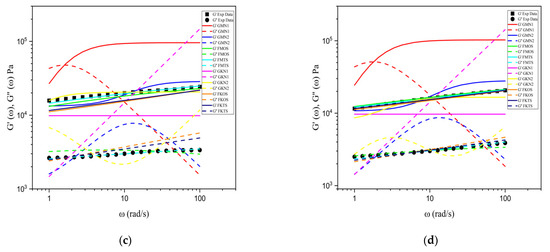 Experimental values of the storage and the loss modulus and generalized Maxwell and Kelvin models (N = 1 and N = 2), fractional Maxwell models with one and two spring-pots, and fractional Kelvin models with one and two spring pots: (a) F1; (b) F2; (c) F3; (d) F4. (GMN1: Generalized Maxwell model (N = 1); GMN2: Generalized Maxwell model (N = 2); FMOS: Fractional Maxwell Model with One Spring-pot; FMTS: Fractional Maxwell Model with Two Spring-pots; GKN1: Generalized Kelvin model (N = 1); GKN2: Generalized Kelvin model (N = 2); FKOS: Fractional Kelvin Model with One Spring-pot; FKTS: Fractional Kelvin Model with Two Spring-pots.)