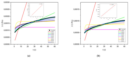 Table 3 shows the values of for the adjustment of the experimental data of creep compliance and the rheological models under study. For the Maxwell and Kelvin generalized models with N = 1, values of were obtained, indicating no adjustments to the experimental data. For F2, the generalized Maxwell model with N = 2 shows a value of , indicating a poor fit to the experimental data.