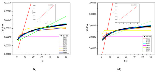 The experimental values of creep compliance and generalized Maxwell and Kelvin models (N = 1 and N= 2), fractional Maxwell models with one and two spring-pots, and fractional Kelvin models with one and two spring-pots: (a) F1; (b) F2; (c) F3; (d) F4. (GMN1: Generalized Maxwell model (N = 1); GMN2: Generalized Maxwell model (N = 2); FMOS: Fractional Maxwell Model with One Spring-pot; FMTS: Fractional Maxwell Model with Two Spring-pots; GKN1: Generalized Kelvin model (N = 1); GKN2: Generalized Kelvin model (N = 2); FKOS: Fractional Kelvin Model with One Spring-pot; FKTS: Fractional Kelvin Model with Two Spring-pots).