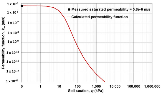 The saturated permeability, ks (5.78 × 10−6 m/s as shown in Table 1) was determined using a constant head laboratory method [30,31]. This is a lower permeability compared with typical poorly graded coarse sand that can range from 10−4 to 10−5 m/s [10]. The reason for this is the higher percentage of plastic fines contained in the sands of 31%. The unsaturated permeability of the sand specimen (Figure 2) was determined using statistical model following procedure presented in Satyanaga et al. [32]. The results from the oedometer test is presented in Figure 3. As the soil is hydraulically filled, the over consolidation ratio is assumed to be 1. The initial void ratio is calculated to be 0.96. The lambda (λ) and Kappa (κ) are 0.0165 and 0.0026, respectively based on the formulas shown in Equations (1) and (2).