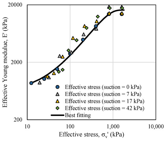 In Equations (1) and (2), cc is defined as compression index whereas cs is defined as swelling index. In Sigma/W, it is possible to simulate the variations in the Young modulus (E′) as a function of effective stress using the elastic-plastic model (w/PWP Change) [18]. The Young modulus for incorporation in Sigma/W (under effective stress material model Elastic-Plastic) was obtained by first determining the coefficient of compressibility (mv) from the oedometer test to determine the constrained modulus (Eoed) (Equation (3)).