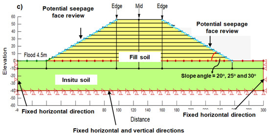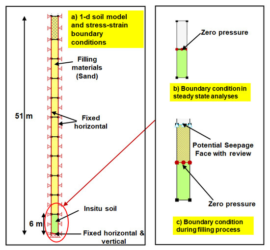 Consolidation settlements at the midpoint and edge of the model based on scenario 1 (Figure 10a) were compared with the results from the 1-D consolidation analyses. The finite element model was separated into the in-situ soil and the filling material. The filling material soil was separated into 11 regions which are 0–5 m, 5–10 m, 10–15 m, 15–20 m, 20-25 m, 25–30 m, 30–35 m, 35–40 m, 40–45 m, 45–51 m and 51–56 m. The soil model and properties of in-situ soil and fill soil followed those used as input in 1-D consolidation analysis of case 1. Every filling layer was consolidated for 1 day with 10 time steps and 2.4 h for each step. The in-situ soil was fixed at horizontal and vertical directions as shown in Figure 10. The zero pressure boundary condition was applied at the interface between the in-situ soil and the fill soil while the potential seepage face with review was applied at the slope surface of the fill layer as shown in Figure 10.