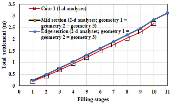 Comparisons of total settlement from 1-d analyses (based on Case 1) and 2-d analyses (based on three different geometries).
