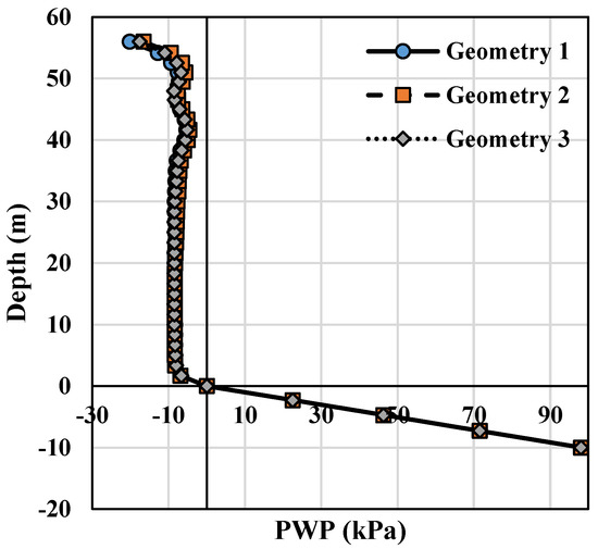 Pore-water pressure profiles at the end of stage 11 for geometry 1, geometry 2 and geometry 3.