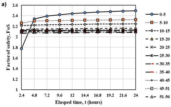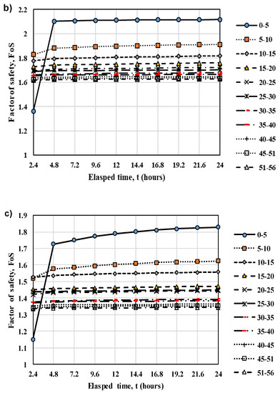 The results from stability analyses of scenario 1 are presented in Figure 13. It is shown that the critical condition is observed when the fill layer has just been placed. As the pore-water pressure dissipated, the factor of safety slowly increases. It is shown that geometry 3 has lower factor of safety compare to other geometries. The lowest factor of safety is observed when the first fill is just placed (0–5 m) with factor of safety = 1.15. The factor of safety increases to 1.73 within 2.4 h. For the rest of the simulations, all factor of safety values are higher than 1.3. The final factor of safety of the road pillar is 1.344 which considered to be the minimum in terms of the design acceptance criteria [36].