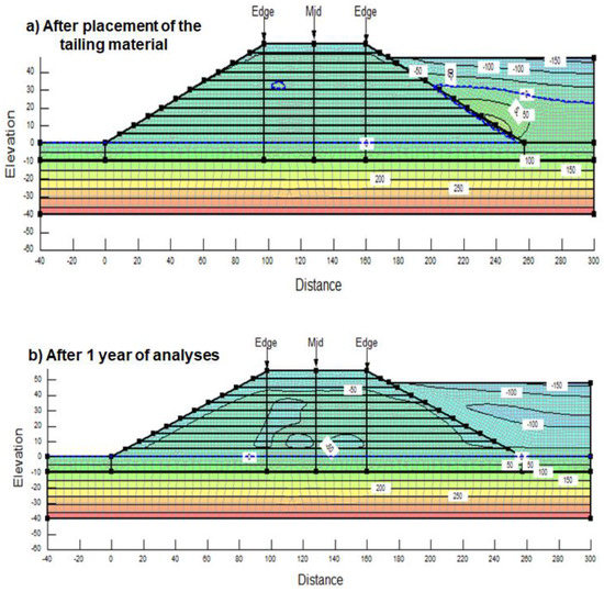 Sediment transport may be encountered during the water flow with high velocity within the high permeability materials. Two-phase flow is usually subjected to a complex mixture between the solid and fluid phases. It is complex to mathematically model, in particular when one considers the unsaturated conditions of the sediments [14,15,16]. Seepage, consolidation and stability analyses for sand tailing have been performed historically by either assuming that the soil to be completely dry, or the entire fill layer undergoing consolidation [17]. Ito and Azam [18] developed a 1-D consolidation model to estimate the behavior of sand tailing during the filling process. However, this method does not take into account the unsaturated soil mechanics principles during the construction of sand tailing. The unsaturated state of these materials may develop as a result of them being situated either above a water table or due to percolation of water down to the soil beneath the tailing because of gravity force during construction stage. In both cases, an unsaturated zone will be formed within the formation of the slope during the filling process [19]. In the unsaturated zone, the pore-water pressure within the soil becomes negative with respect to the atmospheric pressure. The negative pore-water pressure or matric suction contributes to the additional shear strength and improvement to the overall stability of the slope [20,21]. However, the permeability will drop significantly and the unsaturated zone will have very low permeability which delay the dissipation of excess pore water pressure from the saturated zone.