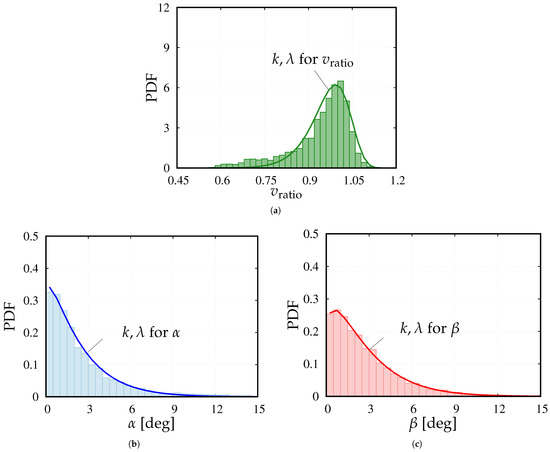 PDF of (a) the reflection angle ; (b) the spreading angle and (c) the velocity ratio . The results correspond to fragments obtained by 64 breakage events of equal impact conditions but with different relative orientations of the agglomerate with respect to the wall. The solid line is fitted to the data by the Weibull distribution given by Equation (4).