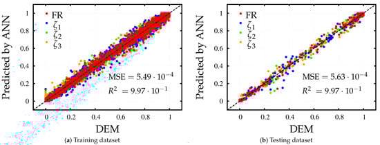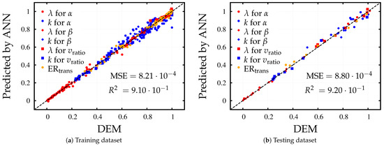 The second network is assigned to the modeling task (iii), i.e., the prediction of the post-breakage velocity of the fragments. It is worth mentioning that a second network is inevitable since the analysis of the DEM results concerning the velocity of the fragments is conducted based on a restricted set of impact conditions as explained in Section 3.1. The network has a topology of 3–6–7, where the three input parameters are , , and FR. The output parameters are the shape k and the scale parameters of the three Weibull PDFs describing , , and and the fragment energy ratio . The input parameters as well as the output parameters are normalized into the range [0,1]. The activation function in the hidden layer is the logistic sigmoid function, whereas a rectified linear activation unit (ReLU) is applied at the output layer. The database is divided into training () and testing () datasets. As depicted in Figure 4, the training of this network leads to a MSE of and on the training and the testing dataset, respectively. The corresponding values are 0.91 and 0.92. Overall, the achieved training performance is reasonable.