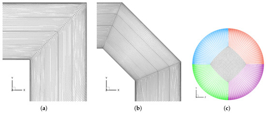Cross-section views of the computational grids of both bend configurations at Re. The grids for the high Reynolds number Re differ only in the number of grid cells. (a) x-y cross-section of the grid for the 90 pipe bend at . Only every second grid line is shown. (b) x-y cross-section of the grid for the 45 pipe bend at . Only every second grid line is shown. (c) Computational grid at the inlet for both investigated pipe bend configurations at . All grid lines are shown.