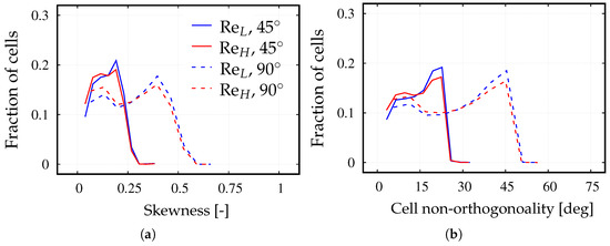 Distribution of the (a) equiangle skewness and the (b) non-orthogonality index. Higher is worse applies for both measures.