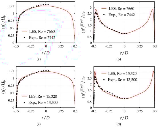 Figure 8 compares the LES results and the experimental measurements. Figure 8a,c depict the profiles of the averaged streamwise velocity normalized by the bulk velocity as a function of the normalized radius of the pipe for both Re and Re, respectively. Although it is obvious that the profiles are symmetric, both halves are shown for the LES predictions since this is proof that the statistics are converged. As expected, the maximum streamwise velocity is found at the center of the pipe. The velocity profiles get flatter with increasing Re number leading to larger velocity gradients at the wall. Overall, a reasonable agreement between predictions and measurements is observed at both Re numbers.