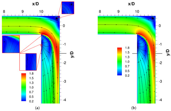 The time-averaged velocity magnitude normalized by the bulk velocity and the corresponding streamlines are depicted in Figure 9a,b for the sharp 90 pipe bend at Re and Re, respectively. In both cases the fully-developed velocity profile upstream of the bend is consistent with the flow in a straight pipe. Further downstream an adverse pressure gradient in the streamwise direction develops towards the bends (not depicted here) leading to the growth of the boundary layer thickness at the outer side of the bend before the flow finally detaches. The separation of the flow gives rise to recirculation zones at the outer corners consisting of a series of asymmetric, counter-rotating vortices. In the present case two counter-rotating vortices could be resolved as depicted in the upper zoom in Figure 9a. Consequently, the flow cross-section is tapered, which causes the flow to be accelerated at the inner kink to globally conserve mass.