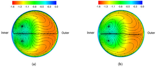 Time-averaged dimensionless velocity magnitude and streamlines of the 90 case in the x–y plane at . (a) . (b) .