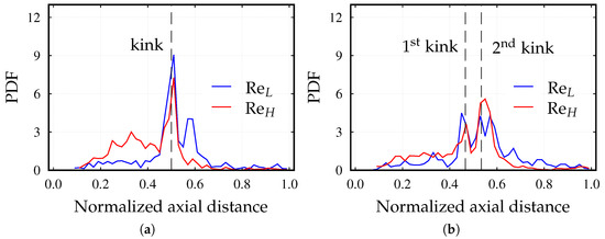 The resolved turbulent kinetic energy normalized by is shown in Figure 11a,b for the Re and the Re cases, respectively. As expected, the strongest velocity fluctuations are found in the shear layer between the recirculation region and the core flow, and inside the recirculation region. Moreover, the resolved Reynolds shear stress is depicted in Figure 12a,b. The distributions can be attributed to the strong velocity gradients at the edge of the shear layer, where the fluid velocity increases strongly towards the outer wall. As visible in Figure 9 showing the velocity magnitude in the symmetry plane as well as Figure 10 depicting the streamwise velocity in a cross-section downstream on the bend, the velocity gradients also remain high a few diameters downstream of the bends. That explains why the Reynolds shear stress remains high far behind the bends.