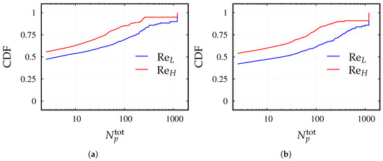 The Stokes number of the agglomerates at the moment of release is about 0.67 or 1.34 for the low and the high Reynolds number, respectively. Note that this Stokes number is built on the convective characteristic time scale . If the viscous time scale is used instead, the corresponding values are 9.84 and and 31.53. Note that in this case, refers to the friction velocity computed in the periodic pipe simulation at the corresponding Re number.