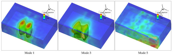 One can note from Table 2 that the first mode (and thus its complex conjugated: mode 2) has almost the same frequency as the super-harmonic present in the spectrum of the transversal velocity . Modes 3, 4, 5, 6, 9, 10, and 11 show the signature of the physical phenomenon of frequency in the transversal velocity, which is associated with the passage of the Kelvin–Helmholtz vortices [25,32]. We can note that modes 7 and 8 have a frequency nearly equal to a super-harmonic . This led us to propose that Kelvin–Helmholtz vortices’ frequency has an important effect on the DMD, as its spectral signature ( is found in the first DMD’s modes, which generally carry the bulk of the energy.